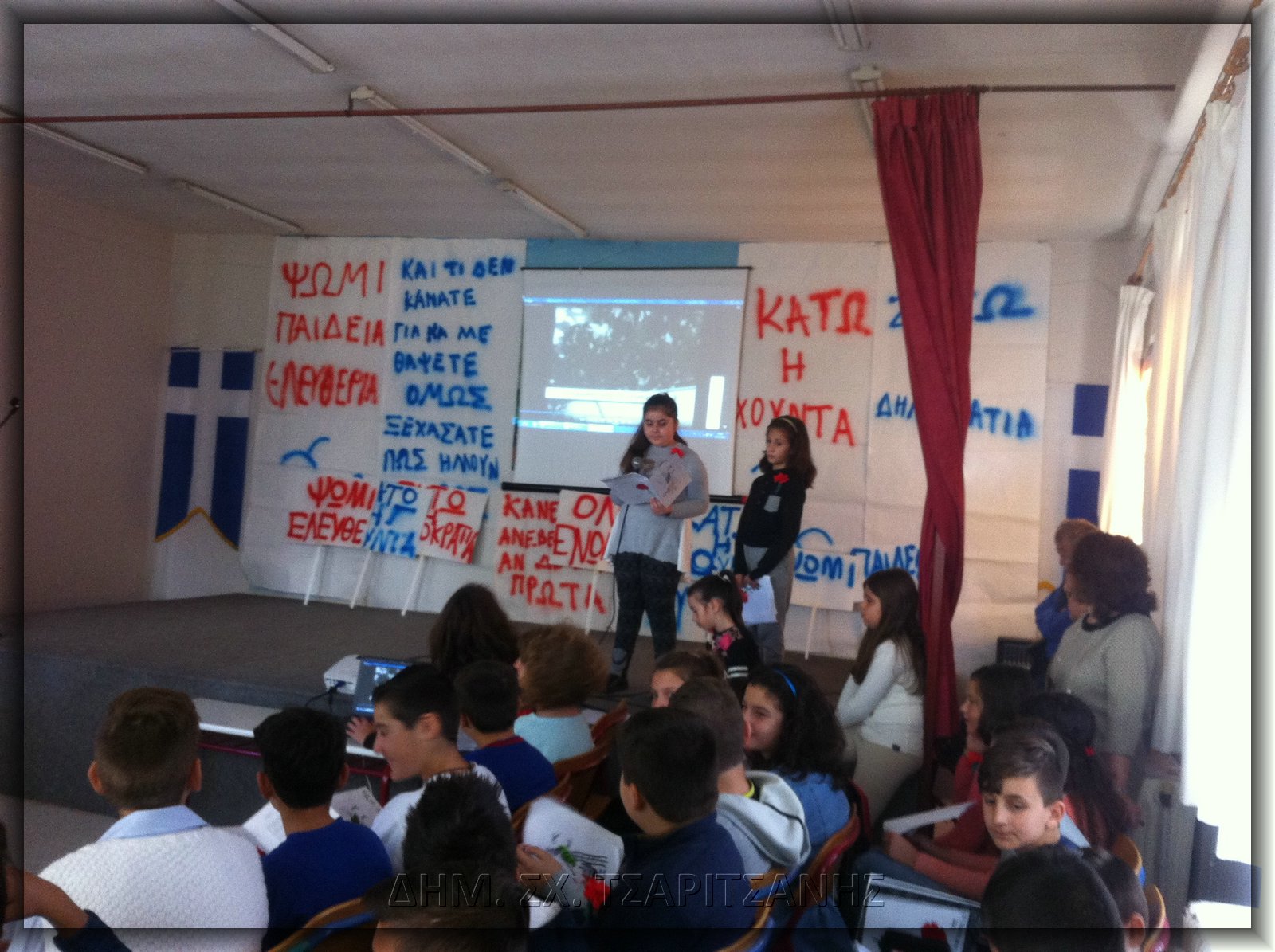 Την εποπτεία της γιορτής είχαν αναλάβει οι δασκάλες των τάξεων Τσουμάκα Ευαγγελία και Μπαλωματή Σταυρούλα.Στην συνέχεια ακολούθησε πορεία με πανό και φιλελεύθερα - ειρηνικά συνθήματα από όλη τη σχολική μονάδα.